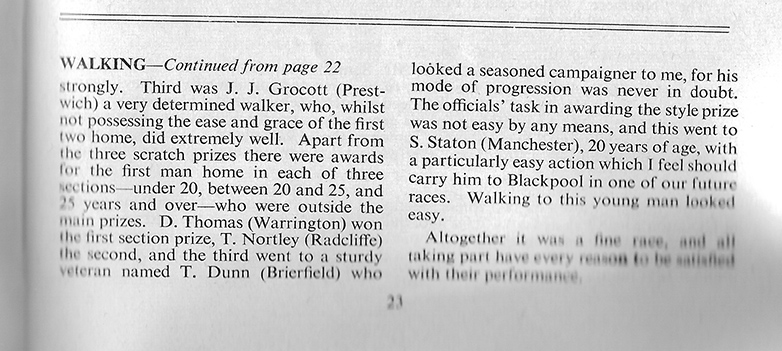 Alfred Scorer, President of the Lancashire Walking Club, penned a Race Walking column for the journal, ‘Athletics Review’ laced with innocent and amusing turns of phrase – witness his comment below on 71 year old Jack Tempest. “The recent summer has tanned that well developed body of his and many risk a backward glance!”