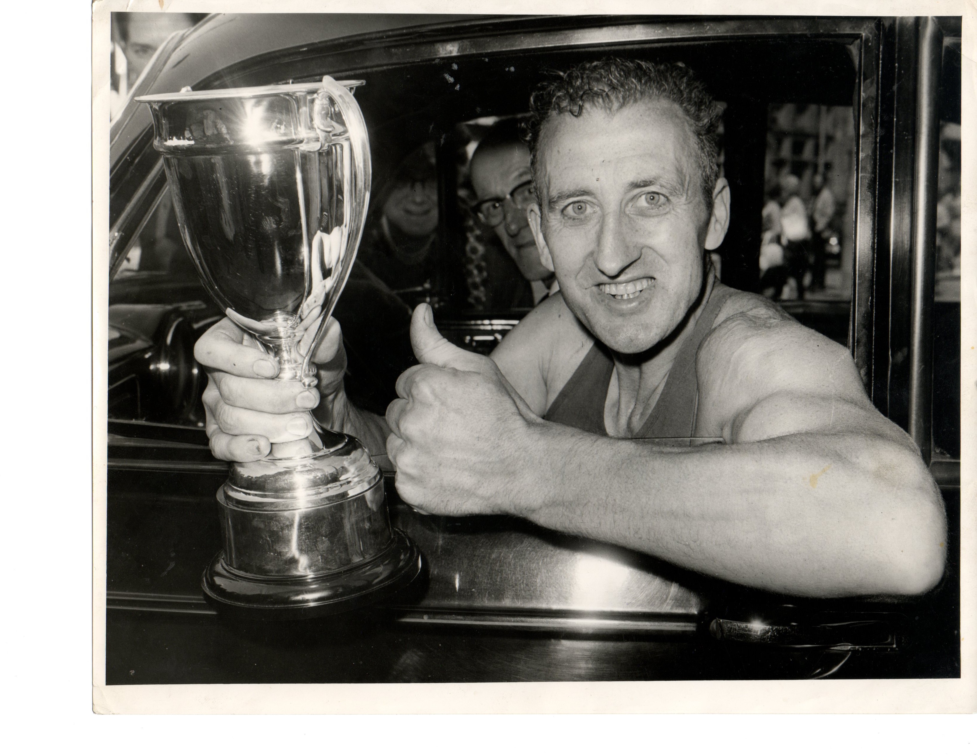 Frank O’Reilly having just won the Manchester to Blackpool race in 1963 is taken to the Corporation Baths by Maurice’s father (looking over his shoulder). Frank won in 8:14:25 from Guy Goodair.