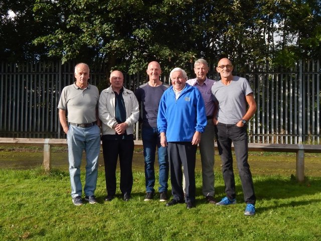 Surrounding Fred a group of those he supported so superbly – from the left Julian Hopkins, Eric Crompton, Mick Entwistle. Ron Wallwork and Tony Taylor