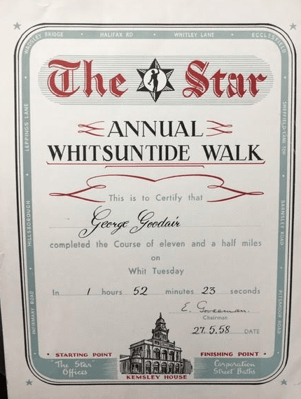 I was a member of Wakefield Harriers and we’d heard all about the famous Star Walk in Sheffield held every year on Whit Tuesday. Now although there were other races over Whitsun there were no local running races on the Tuesday so four of us decided to enter. The Star Walk was for ‘novices’ (those who hadn’t won a prize at race walking) although Sheffield United Harriers ‘groomed’ likely winners by telling potential winners to make sure they didn’t get into SUH’s medal or prize winning teams in the months before the race. The race was 11.5 miles long which was a long way for novices but luckily for us we’d done lots of long running races including marathons so the distance didn’t bother us. There were big crowds at the start and we were well back but gradually started catching the early leaders once we’d got past Hillsborough and climbing up Halifax Road.
