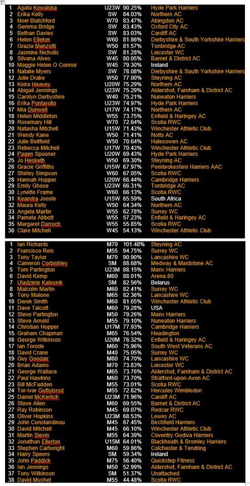 Record your performance, and earn bragging rights via World Athletics point scores (M/F, junior age groups M/F).