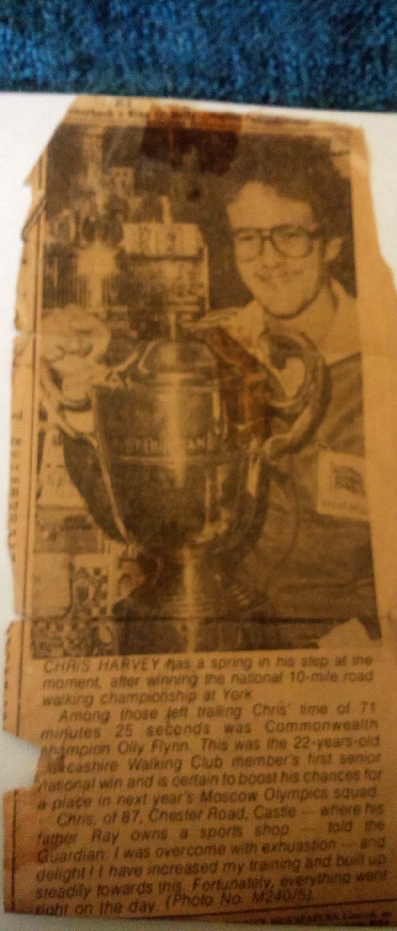 Following Ron Wallwork’s exploration of the club’s team successes at a national level and the barren years after the early 70s it is revealing to mark Chris Harvey’s individual victories in the Junior 10 kilometres in 1978 and Senior 10 miles in 1979. The painful irony is that as Chris’s talent blossomed the nucleus of the competitive teams of 1969/70/71 pursued an abortive attempt to create a Blackburn Harriers Walking section. This brief, even ignominious adventure, usually brushed under the carpet, will get some serious attention in the near future. For now it left Chris, apart from Tony Malone, without the back up necessary for the club to mount a challenge in the team competitions. Indeed such was their frustration that Chris and Tony joined for a time the then up and coming York Postal Race Walking Club.