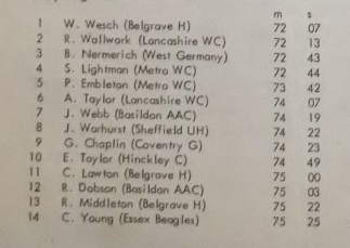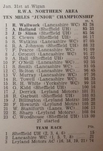 Ron’s first title was to see him the Northern ‘Junior’ 10 miles champion in February 1959 at the Hindley Green Labour Club, Leigh. Only a mile way from my home I was a diminutive spectator. The Junior title had nothing to do with age. It meant merely that competitors had neither won individual or team Senior medals. Ironically a few weeks later Ron was prevented from racing in the Northern Senior 10 at Sheffield as at 17 years of age he was too young.