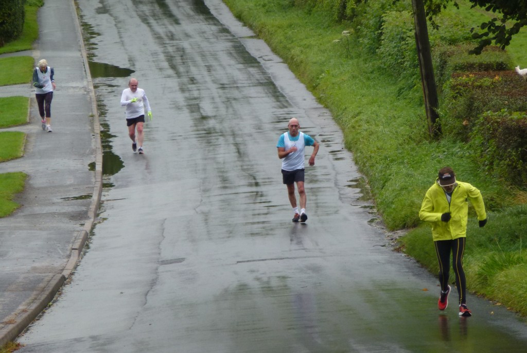 To make the event a bit more unpredictable the handicapper rearranged the 4 starts with groups setting off at intervals of scratch, 2 minutes, 3 minutes or 4 , with the last wave comprising the likely fastest walkers. The course is an out and back which affords the aspirants the opportunity of repeating this exercise three times. I make the case that it keeps everyone informed of what is happening throughout which is either uplifting or depressing !