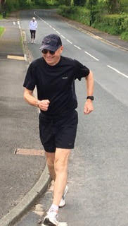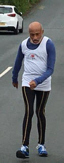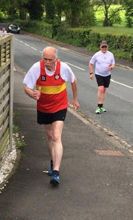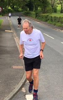 Being an out and back course meant some leg sapping ascents but equally leg testing descents. Most club walkers are hardy souls and rise to the challenge of big ups and downs. At the 3 and a half mile point Eric Horwill reminded them of their midway times and it was clear that some of the more genteel starters were beginning to close on their adversaries. Quite a few were destined to record negative splits. Adrian reached halfway in 38 mins 50 seconds and both Eric and I had to rub our eyes when Ian Hilditch came into view only 73 seconds adrift. Glyn Jones was sticking to his task particularly well and seems to be recovering from his recent back problems. In practice, this is not a course to help such a condition but nevertheless, he raced on. Hot on the heels of Glyn was a trio of “youngsters” but as the final results showed they lost time on the homeward stage.