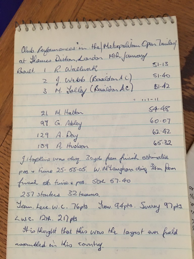 RW 51.13, Mike Hatton 21st/54.48, Graham Abley 97th/60.07, Alan Day 129th/62.42 and Alan Hudson 159th/65.32. LWC 12th  team. Julian was disqualified 30 yards from the finish and Bill McLoughlan suffered a similar fate 3/4s of a mile from the end. A cynic might have a view on how this affected the team race!