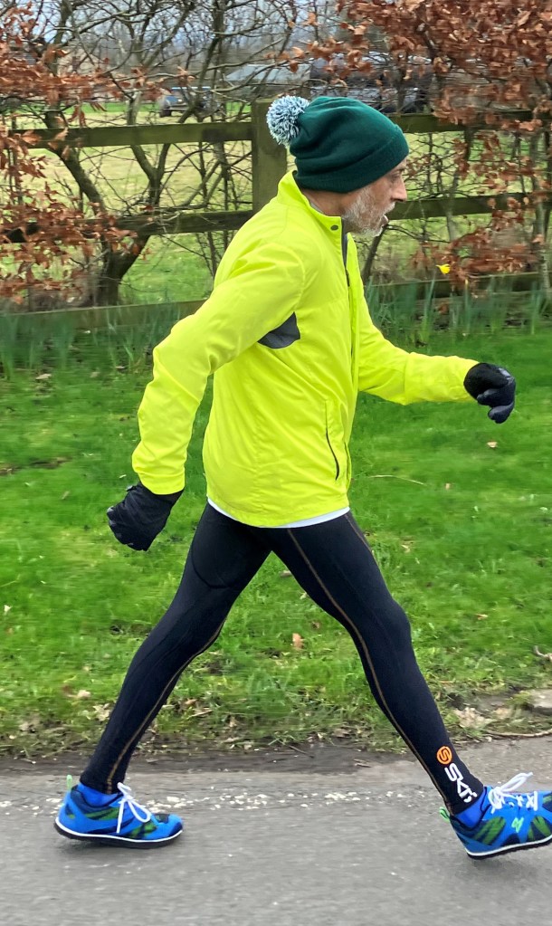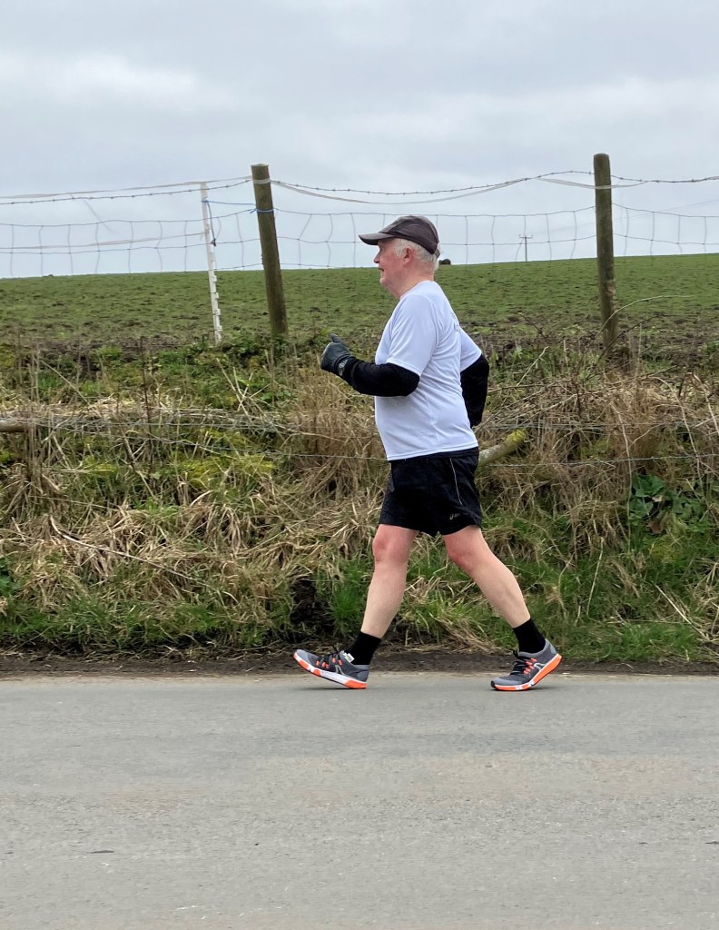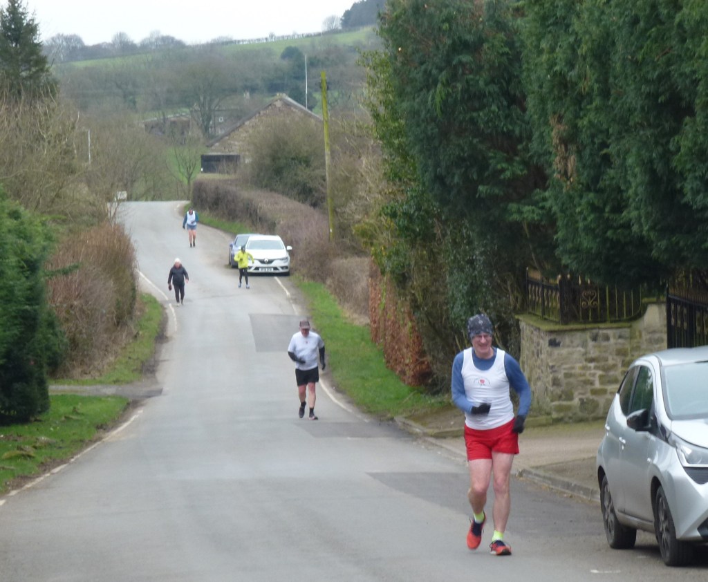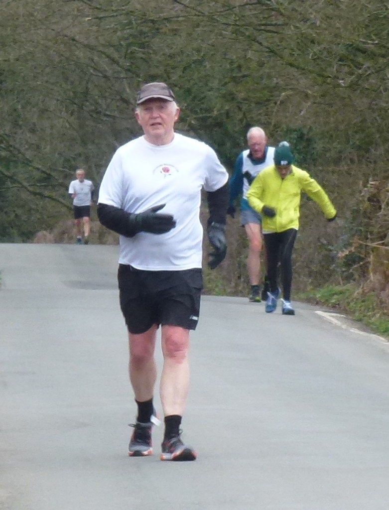The course included a combination of roller coaster roads leaving the performers with insufficient time to recover from one ascent before being hit with another. Passing the first time keeping point at 1 mile it was clear that Martin Payne had put down his marker clocking a swift 11 minutes 01 almost 40 seconds clear of Tony Bell and Roy Gunnett. Having passed this first checkpoint the real work begins with a continuous climb of roughly half a mile but it feels further. The next section offers those tired legs a reprieve akin to a ski jump after which the terrain switches to more regular variations. While most would accept these testing surfaces with good grace the prospect of 3 circuits is mentally debilitating. As the leading performers at roughly 3 1/2 miles cruised past the voluble Eric Horwill the positions were changing and the demands of the cold weather and the tough climbs and descents had an effect. At 5.8 miles the times reflected an acceptable 10k clocking and there was still 5k to go. Pat Evans was “protecting” a recent knee problem so stood down at this point and Greg Smith, who provides most of the club action photos, did a short 4K walk and added more action sequences for current use and the future.