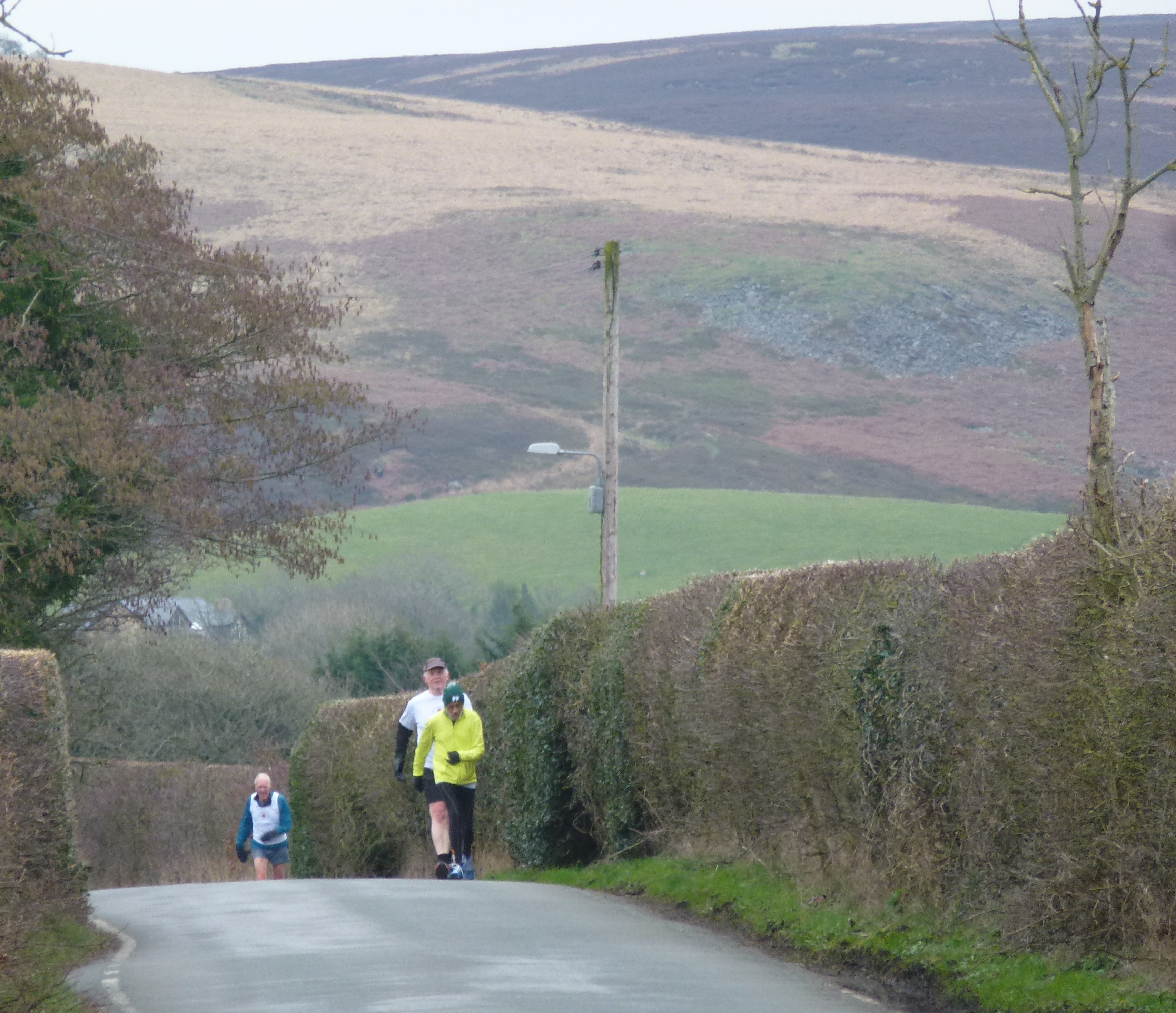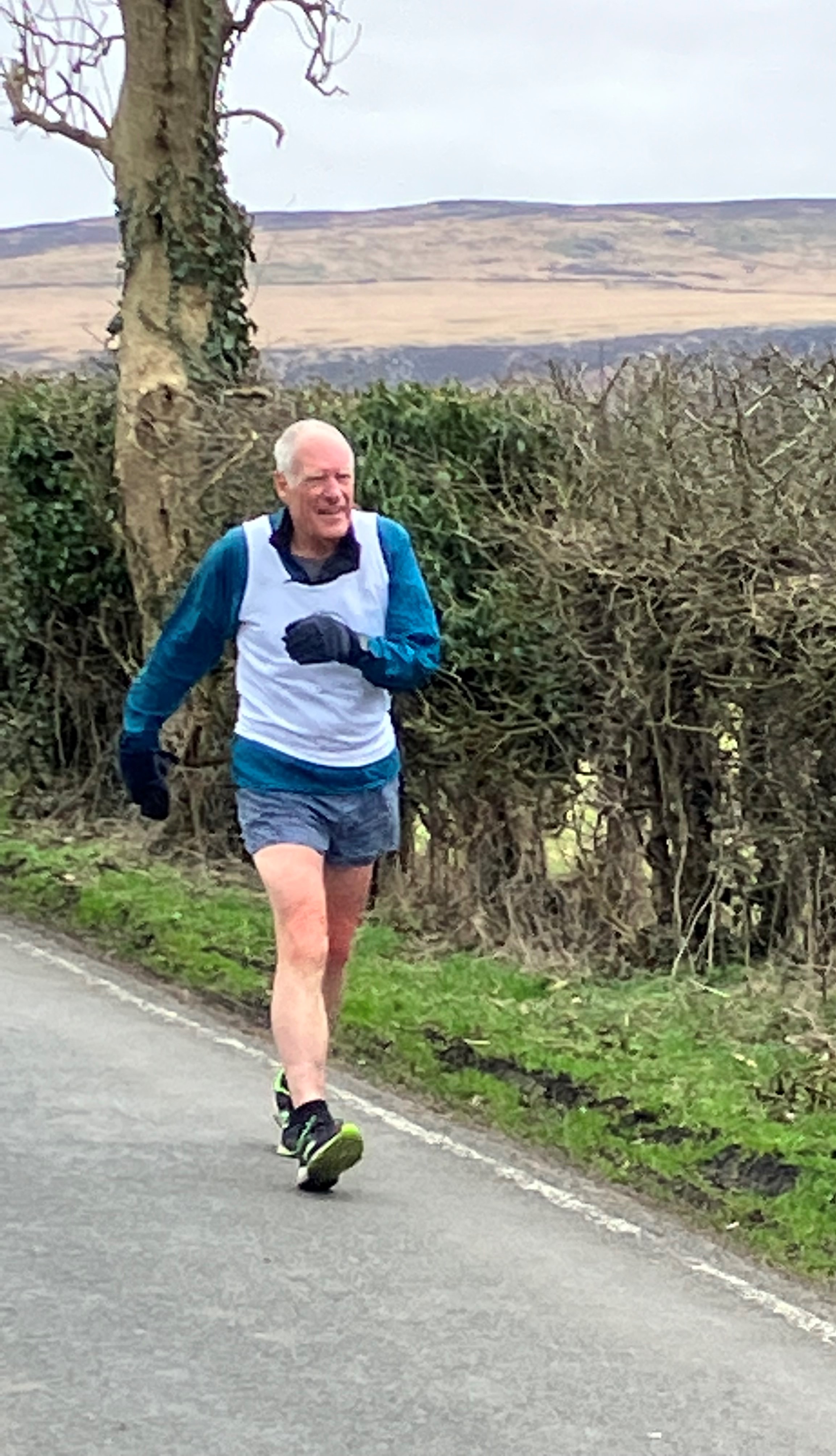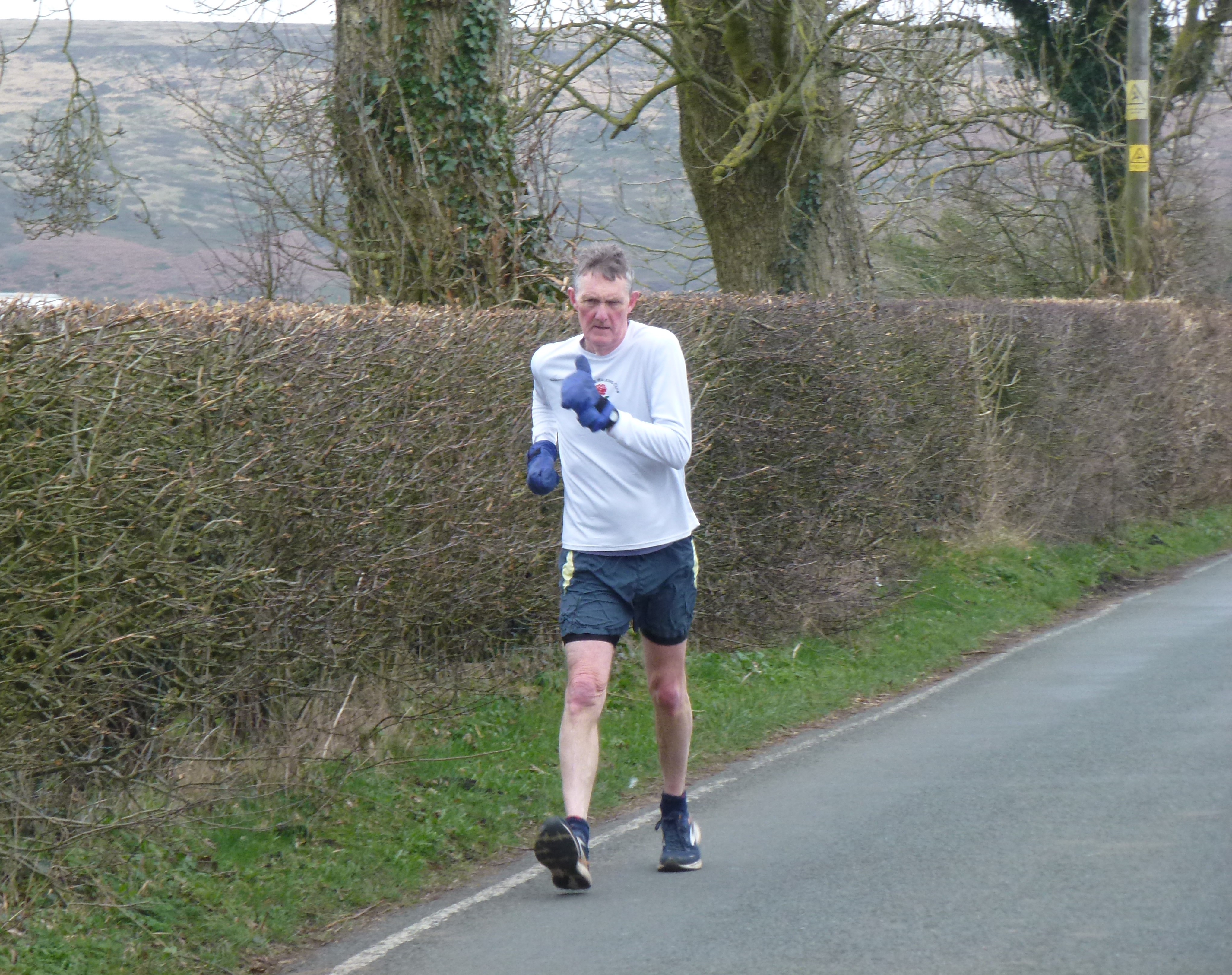 The course included a combination of roller coaster roads leaving the performers with insufficient time to recover from one ascent before being hit with another. Passing the first time keeping point at 1 mile it was clear that Martin Payne had put down his marker clocking a swift 11 minutes 01 almost 40 seconds clear of Tony Bell and Roy Gunnett. Having passed this first checkpoint the real work begins with a continuous climb of roughly half a mile but it feels further. The next section offers those tired legs a reprieve akin to a ski jump after which the terrain switches to more regular variations. While most would accept these testing surfaces with good grace the prospect of 3 circuits is mentally debilitating. As the leading performers at roughly 3 1/2 miles cruised past the voluble Eric Horwill the positions were changing and the demands of the cold weather and the tough climbs and descents had an effect. At 5.8 miles the times reflected an acceptable 10k clocking and there was still 5k to go. Pat Evans was “protecting” a recent knee problem so stood down at this point and Greg Smith, who provides most of the club action photos, did a short 4K walk and added more action sequences for current use and the future.