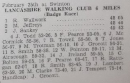 However, and as if predestined, my fate was sealed. in 1960 whilst returning from an engineering training course (old GPO) a person by the name of Chris Bolton, travelling in the same car, was prattling on about how he had raced in the Manchester to Blackpool event. I joined the conversation by stating that my father had also done that event and on how I had assisted in the “100”; I think Chris was a little taken aback by finding that I was aware of the sport and such events. Shortly after this meeting Chris and I were sent to work in the same Telecoms Centre and I frequently heard stories about his recent races; this gave me the opportunity to pull his leg about race walking and how anybody could walk at the speed of 6 miles in an hour. However, and as you would expect, Chris planned his revenge, one particular day he set me up in front of our colleagues to the point where he said that I could not walk 6 miles in the hour as I was boasting. Obviously I laughed at him until he said that he had entered me on the next Saturday afternoon to compete at Worsley with LWC; I was trapped. The year 1961. Needless to say, I had to turn out, but I am very proud of the fact that I did manage to beat the hour (by 30 seconds) and was awarded the 6 Miles in the Hour badge from the RWA; this was the start of my race walking career and thanks to Chris, many, many hours of superb sports involvement.