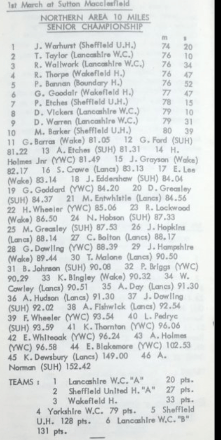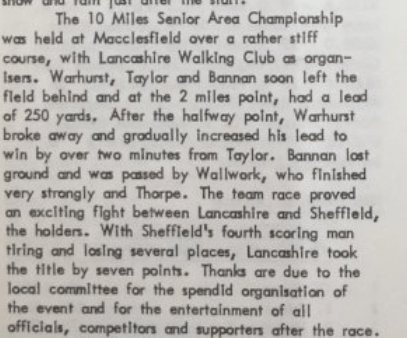 Mention of Don Warren, in particular, and the tough Langley route, together with meeting Chris Bolton and Tony Malone back in the club last Saturday found me in a nostalgic vein. In 1969 the Northern 10 miles championship was held from the Ex-Service Men’s Club. Jim Hackwood of Sheffield United Harriers, the Northern Area correspondent for the Race Walking Record reported.