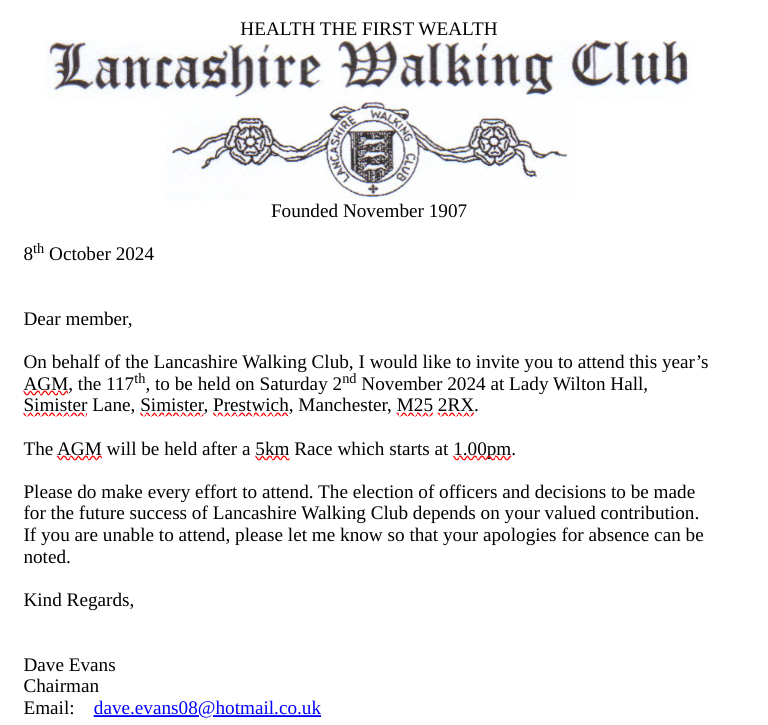 The AGM 5 kilometres race will start at 1,00 p.m. As ever it will be really helpful if you could let Dave know if you are attending and in what capacity.
