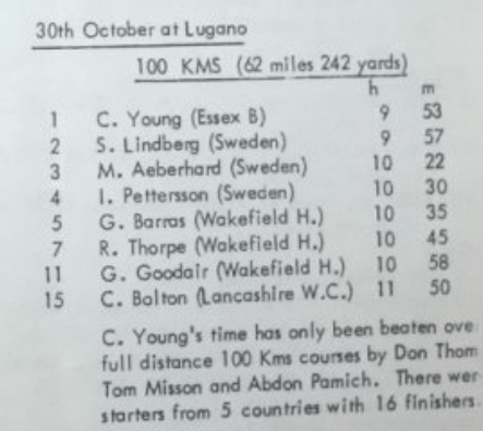 On 24th October in a 10.5Km in Lugano you will find Guy Goodair and myself and on 30th October again Guy and myself in the 100km won by Colin Young. Colin was very popular in Lugano, especially when at the presentation he thanked the organisers in Italian.