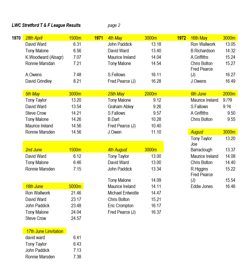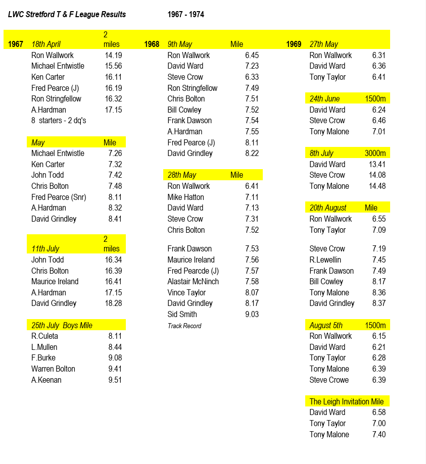 Quite some time ago Ron Wallwork put together the following results of the races held under the banner of the Stretford Track and Field League from 1967-1974. I wanted to provide some context to this revealing data and at first I was confident I would track down the history of this significant initiative. Alas, this has not been the case. Even the website of the Trafford Athletic Club, successor to the original 1964 Stretford AC, in its historical section, mentions the League only in passing. Although it does recognise the innovative contribution of Roger Colson, who was working as civil engineer for Stretford Borough Council and running for Manchester AC as one of their top middle-distance runners.