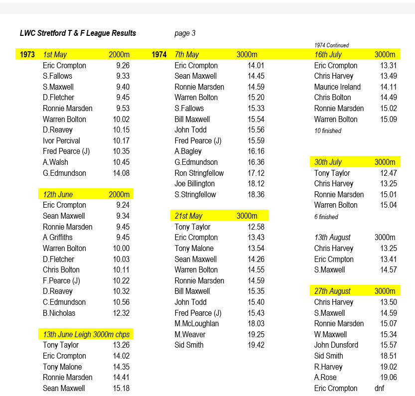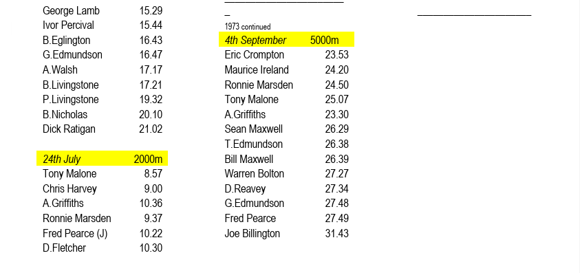 The elephant in the room is that 1973 saw a group of us, Ron, myself, Julian Hopkins, Chris and Warren Bolton, together with Fred Pearce and Guy Goodair join Blackburn Harriers. In retrospect it was a huge mistake. However the principal reason for our departure, our desire to emphasise race walking as a discrete discipline within athletics as a whole was not without its merit. Given this post is focused on the Stretford AC Track and Field League the reader might well wonder why we didn’t consider a move to Stretford rather than Blackburn. As it was, within only a few years all of us had returned to Lancashire’s colours, apart from Ron, who had embarked on a new career, moving to Leicestershire and East Anglia. One of these days I will offer a fuller account of this short-lived dramatic interlude in our club’s history.
