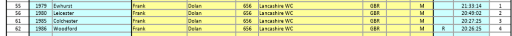 I am pretty sure that I first met Frank in June 1980 as I passed him a sponge as he competed in the Blackpool of that year. I had no recollection of his smiling face from earlier years, which made his presence in a One Hour race result from 1968 perplexing. After some detective work we are pretty sure that the Frank in the 1968 is Frank Dawson from Preston and not the Frank Dolan of this tribute, who hailed from Carlisle. A case of mistaken identity.