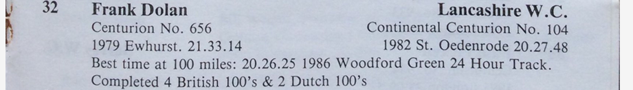 In fact his formidable achievements on the road in the longer distances have been perhaps overlooked, even in our own ranks. Frank is our most prolific 100 miler, having completed four, one more than the marvellous Hazel Fairhurst. In addition he finished two further Hundreds on the continent – see below. This information was found by Roy Gunnett in the programme for the London Vidarians 1996 ‘Colchester 100’, which Frank didn’t finish or perhaps didn’t start.