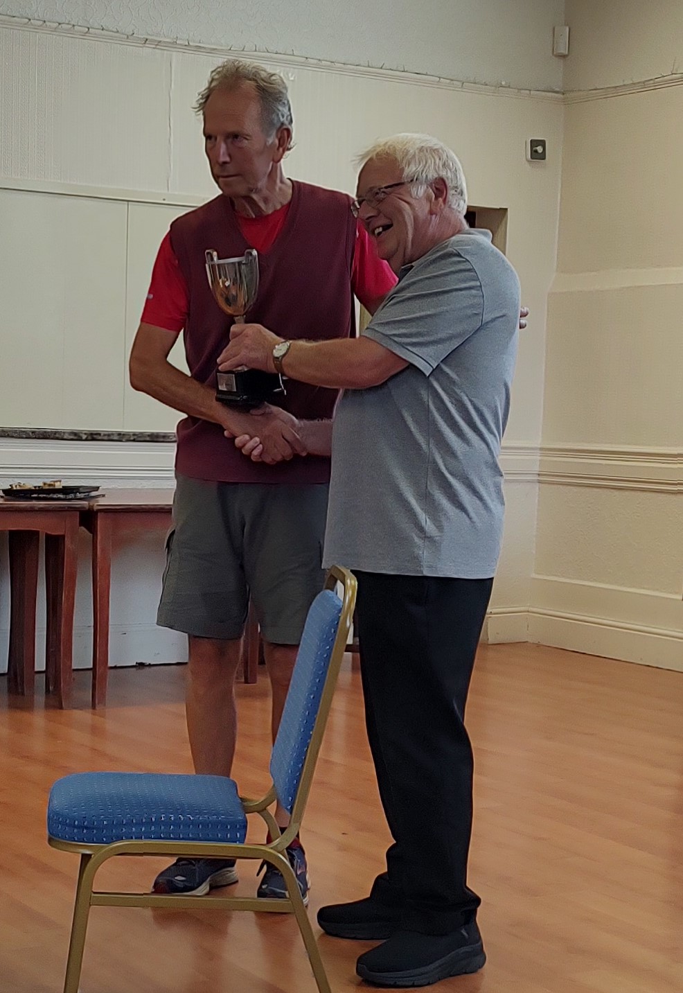 A lovely photo of two smiling race walkers as Roy receives the Goodwin Trophy